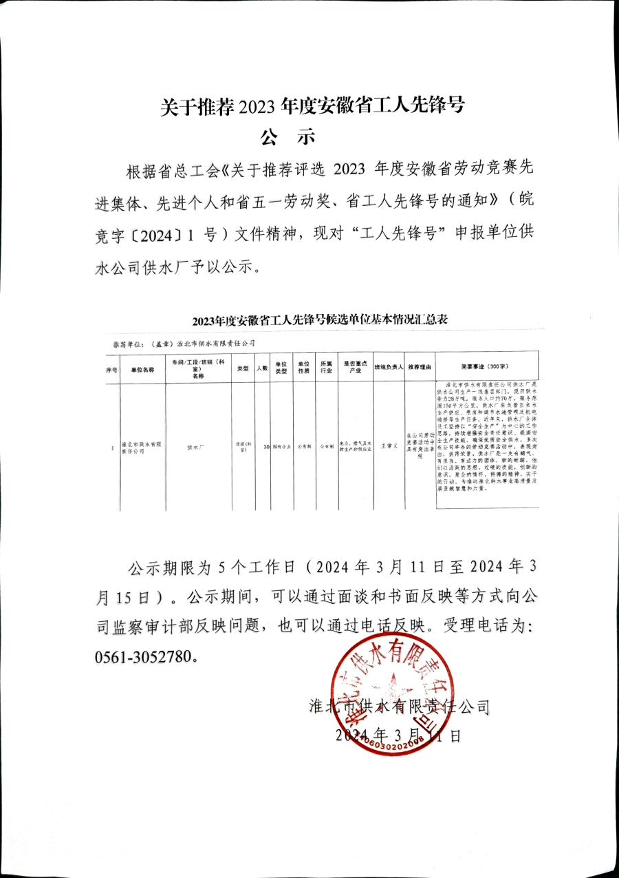 關于推薦2023年度安徽省工人先鋒號公示