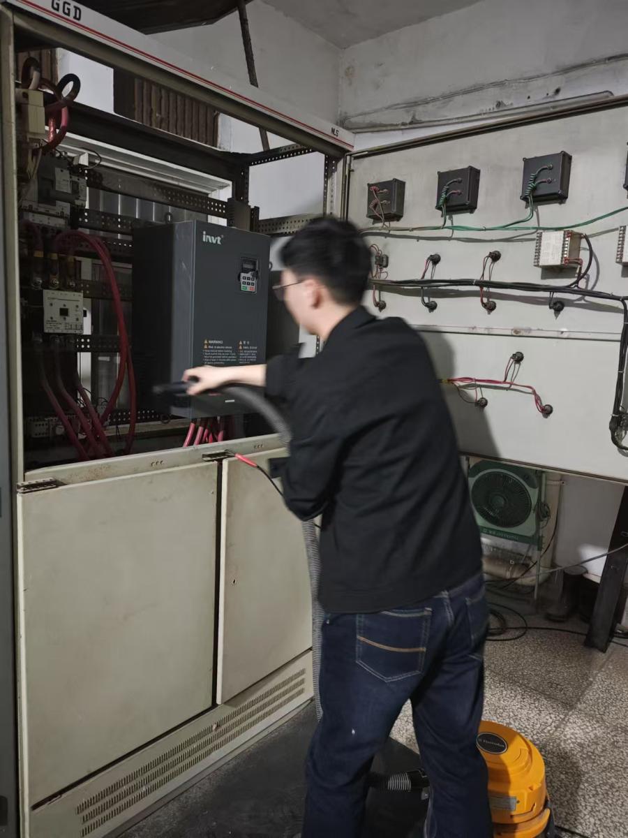 經(jīng)過仔細(xì)檢測,維修人員精準(zhǔn)定位問題:變頻器內(nèi)部灰塵堆積,散熱過慢,導(dǎo)致過熱停機,遠(yuǎn)程控制設(shè)備電源故障。面對復(fù)雜的故障,他們分工明確,一組負(fù)責(zé)維修變頻器,小心翼翼清理灰塵;另一組全力搶修遠(yuǎn)程控制設(shè)備,仔細(xì)排查、重新接線更換電源。